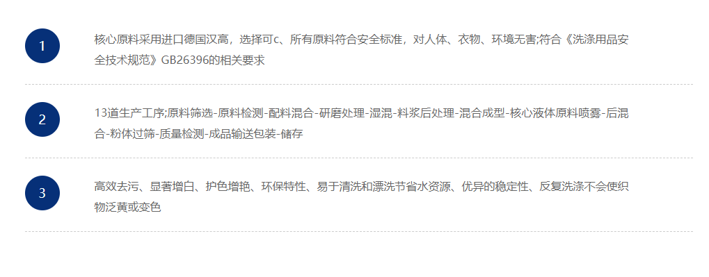 内含多种去污乳化助洗添加剂,有效清除纺织品附着的动、植物油、和矿物油等顽固颗粒及油溶性污渍,使洗涤发挥更强劲,清洗后织物鲜艳亮洁。