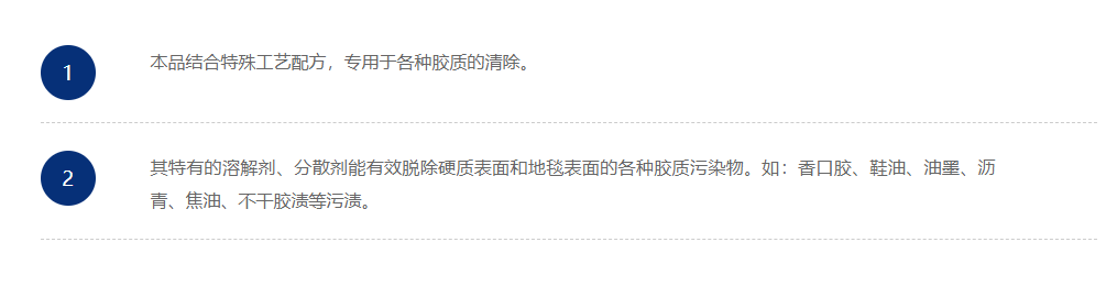 本品结合特殊工艺配方,专用于各种胶质的清除。其特有的溶解剂、分解剂能有效脱除硬质表面和地毯表面的各种胶质污染物。如:香口胶、鞋油、油墨、沥青、焦油等污渍。