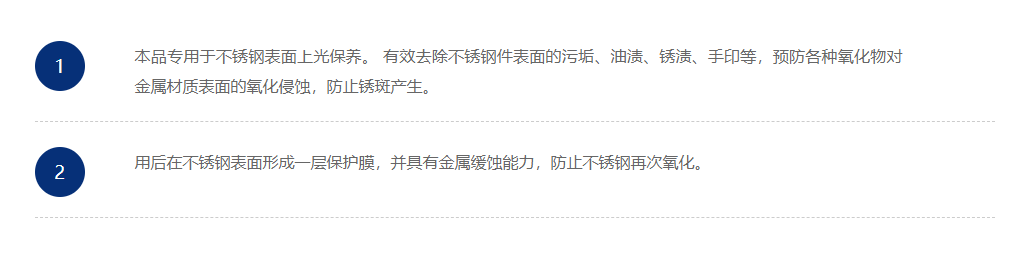 本品采用油性保养配方,有效清洁不锈钢、钛金等制品表面多种污渍,还对钢面有保养作用,减少二次污染,适合用于室内钢面的清洁与保养。
