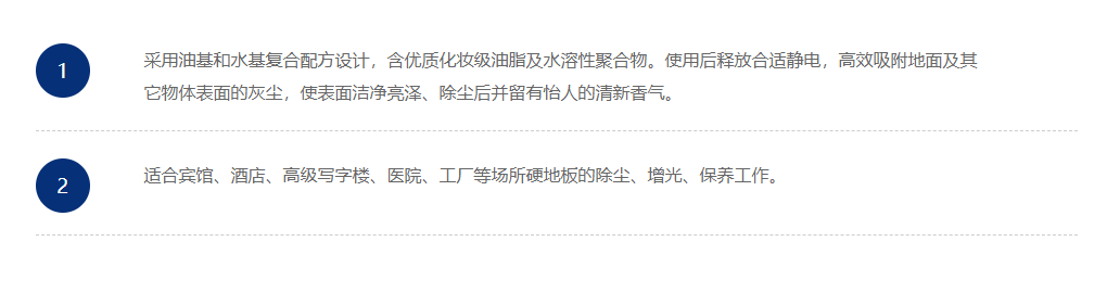 本品含光亮剂及润滑剂等成分,通过尘推的拖动产生静电,对灰尘、细小砂粒等污渍有较强的吸附和牵引,还对蜡面有增光、保养作用。