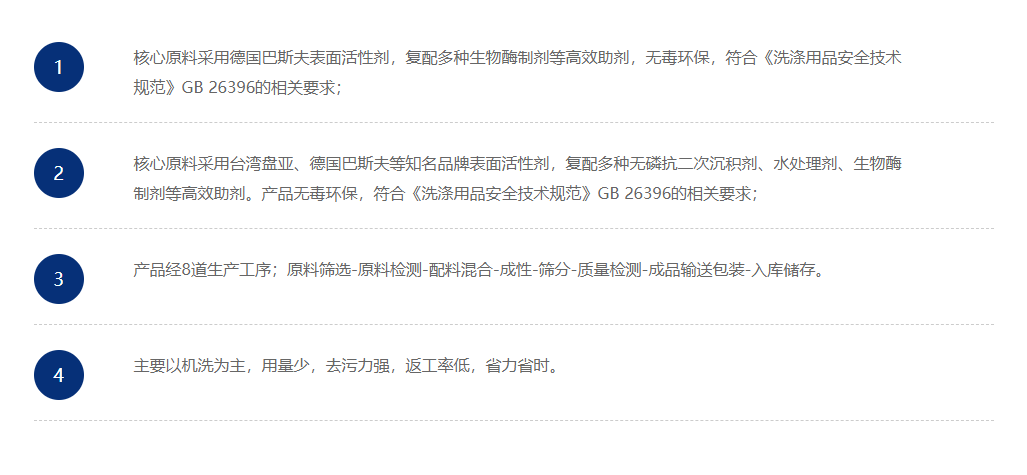核心原料采用台湾盘亚、德国巴斯夫等大品牌表面活性剂,复配多种无磷抗二次沉积剂、水处理剂、生物酶制剂等高效助剂。产品无毒环保,符合《洗涤用品安全技术规范》GB 26396的相关要求;