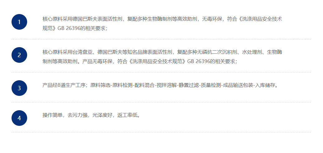 核心原料采用多种还原性有机酸复配而行,性质温和。有机酸杀菌除臭,快速彻底。高效护色,不伤面料颜色,适合酸性染料的护色。