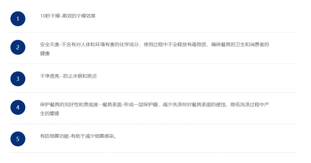 本品为低泡浓缩配方,是配套洗碗机专用清洁剂的一款高效餐具清洁光亮剂,特有的干燥配方,通过降低水的表面张力,使喷淋后的餐具形成均匀薄水膜而快速干燥,促进餐具快速干燥且不留痕,避免细菌滋生。