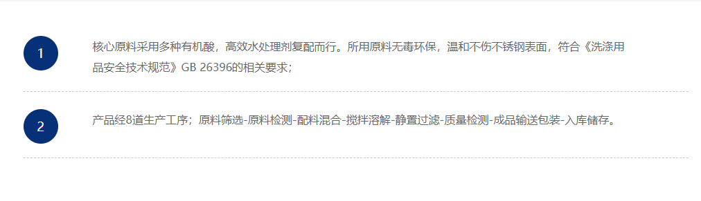 本品为酸性,可有效去除各种器皿内的水垢,除垢迅速方便,有效保护器皿及设备。