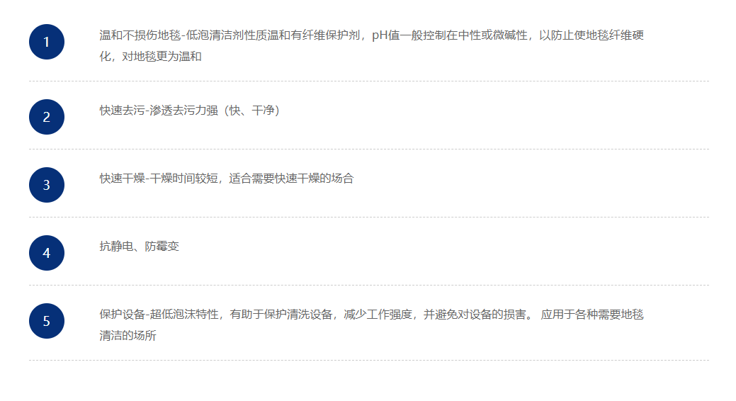 本品采用高效低泡浓缩配方,可迅速渗透到织物的纤维间隙,配合抽洗机的特殊功能,将隐藏在地毯深层的污渍彻底刷出并吸除,特别适合清除中长毛地毯上的 油污和残留在地毯的高泡地毯水余渍,并能防止地毯滋生寄生虫。